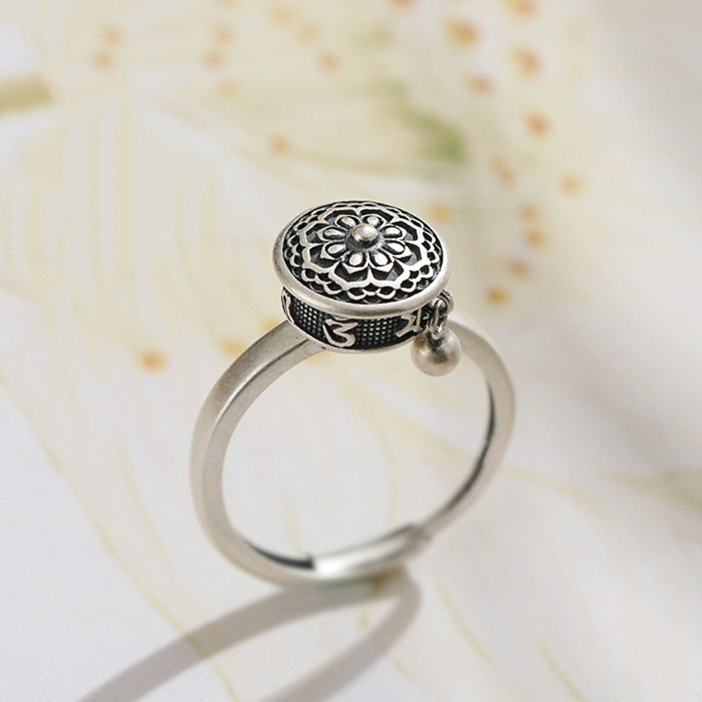 💮El centro del anillo representa la rueda de oración del Tíbet. Estas ruedas consisten en un cilindro lleno de mantras tibetanos, oraciones espirituales y zumbidos en este caso concreto.
